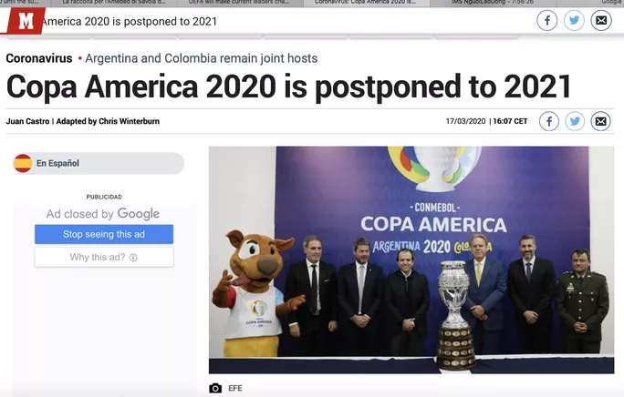 Không chỉ EURO mà cả sự kiện được quan tâm hàng đầu tại Nam Mỹ là Copa America 2020 cũng phải dời lại một năm, đủ để truyền thông thế giới làm nóng các kênh thông tin của mình trong 24 giờ qua.