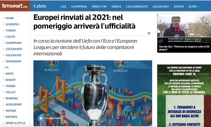 Bài viết "VCK EURO sẽ hoãn đến tháng 6-2021" đăng tải trên trang nhất tờ Tutto Sports (Ý) nhắc đến cuộc họp của UEFA với 55 LĐBĐ quốc gia thành viên và các Hiệp hội giải đấu, Liên đoàn cầu thủ đã thông qua quyết định dời EURO 2020 đến mùa hè năm 2021. Tuy nhiên, đây mới chỉ là thỏa thuận đầu tiên và sẽ còn nhiều buổi thảo luận khác nữa của UEFA về tình hình diễn ra các giải VĐQG tại châu Âu dựa theo diễn biến của đại dịch Covid-19.