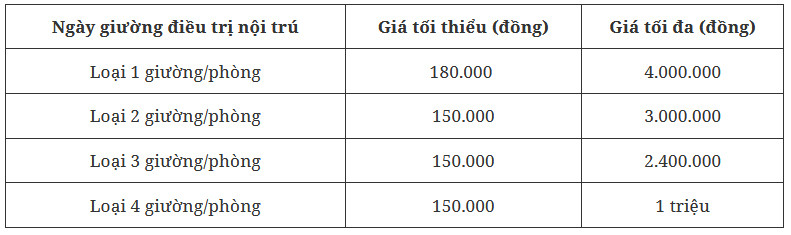 Khung giá ngày giường điều trị theo yêu cầu chưa bao gồm tiền thuốc, các dịch vụ kỹ thuật y tế như sau: