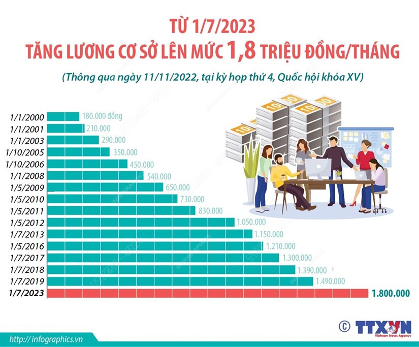 Ngày 11/11/2022, tại Kỳ họp thứ 4, Quốc hội khóa XV, các đại biểu đã biểu quyết thông qua Nghị quyết về dự toán ngân sách nhà nước năm 2023. Theo Nghị quyết, từ 1/7/2023, thực hiện tăng lương cơ sở cho cán bộ, công chức, viên chức lên mức 1,8 triệu đồng/tháng.