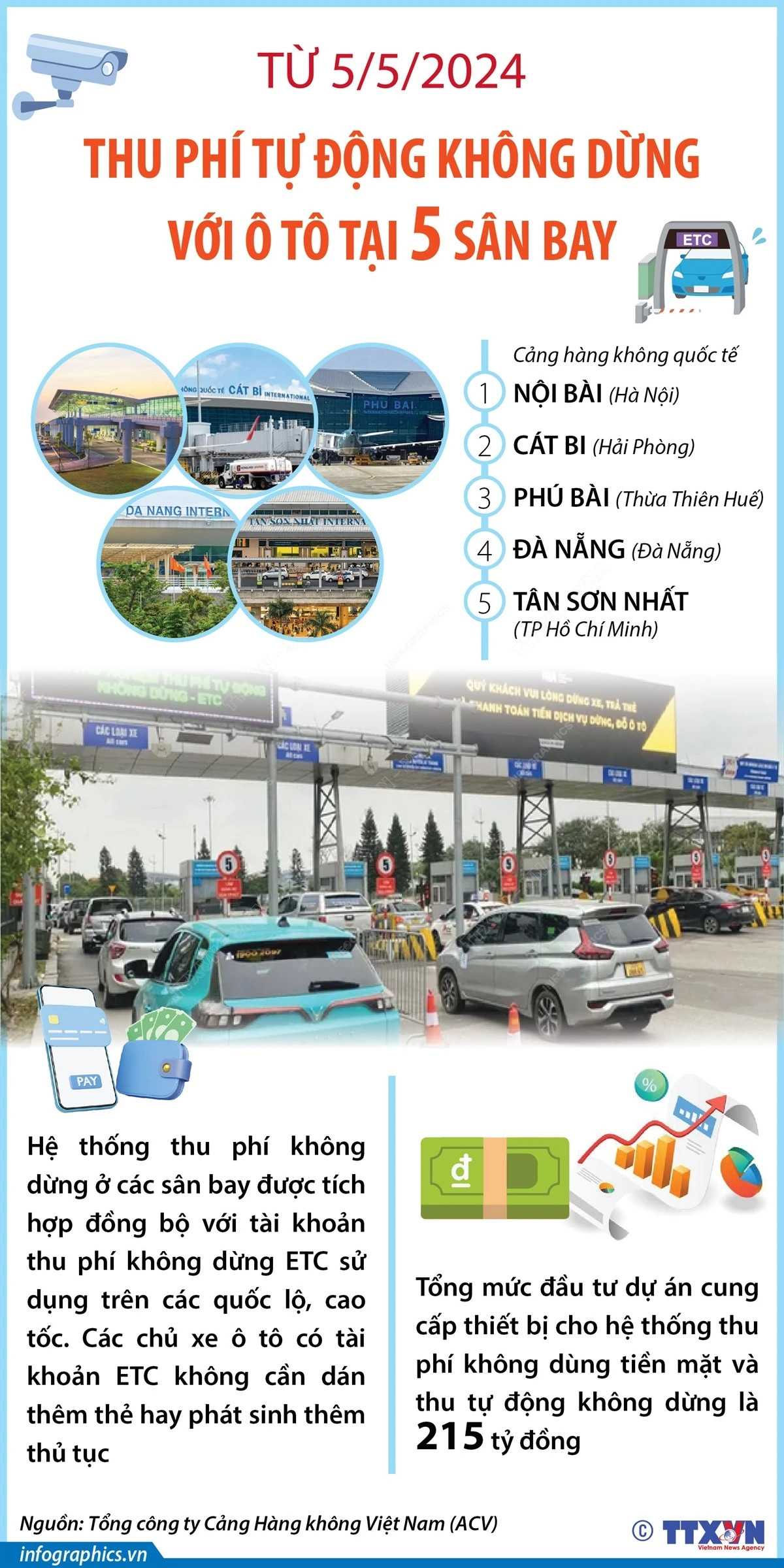 Từ ngày 5/5, hàng loạt cảng hàng không lớn trên cả nước chính thức triển khai thu phí tự động không dừng với ôtô ra vào sân bay gồm Nội Bài (Hà Nội), Cát Bi (Hải Phòng), Phú Bài (Thừa Thiên Huế), Đà Nẵng (Đà Nẵng) và Tân Sơn Nhất (Thành phố Hồ Chí Minh).
