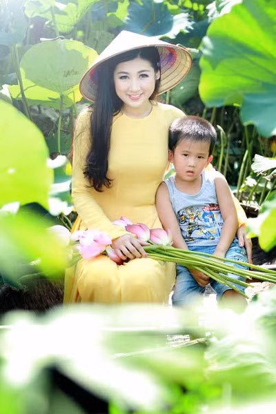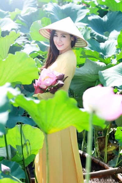 Á hậu Việt Nam 2012 diện áo dài, thả tóc xõa chèo thuyền trên hồ, hái những bông sen thơm ngát trong cái nắng rực rỡ sớm mùa hè.