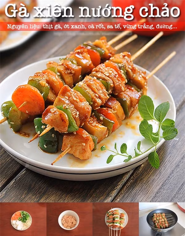 Gà xiên nướng rau củ này cũng rất dễ biến hóa. Nếu không thích ớt ngọt, bạn dùng hành tây hoặc ngô bao tử cũng được. Để tiết kiệm thời gian bạn có thể dùng chảo để nướng luôn nhé!