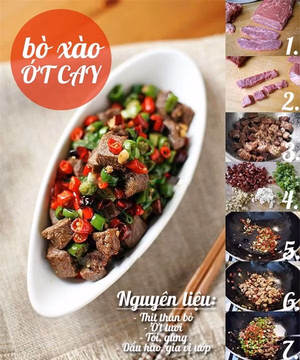 - Trong chảo dầu nóng, cho gừng, tỏi và một ít vào phi thơm lên, sau đó thêm thịt bò vào xào. Sau khi đảo đều khoảng 1-2 phút, bạn thêm nốt phần ớt còn lại vào, nêm nếm dầu hào và gia vị cho vừa miệng rồi tắt bếp.