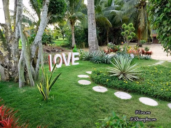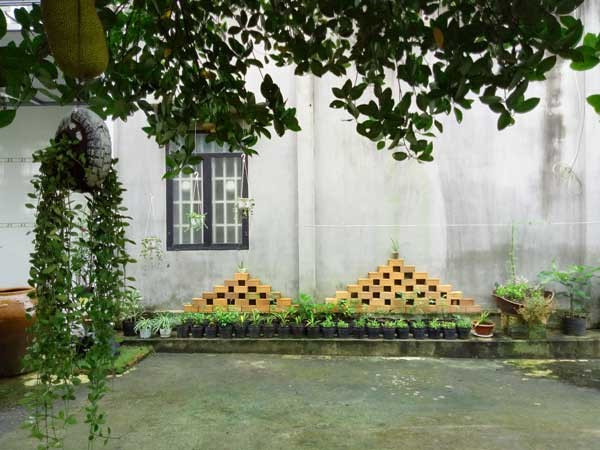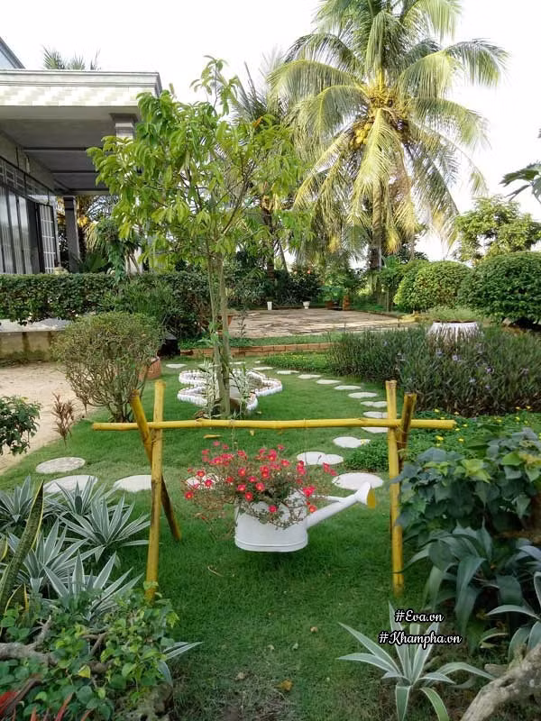 Mình tận dụng hoa đã có sẵn hoặc xin từ lâu về nhân giống để trồng. Đá hình tròn và hình trái tim mình tự làm từ xi măng do gia đình làm sân còn dư. Thấy xi măng bỏ đi thì phí và hư hỏng nên mình quyết định đổ chúng thành hình. Ngày ngày, mình vừa phải suy nghĩ và vừa phải làm cho hoàn thiện để không gian vừa gần gũi với thiên nhiên lại vừa mang một chút hiện đại trong khâu thiết kế.