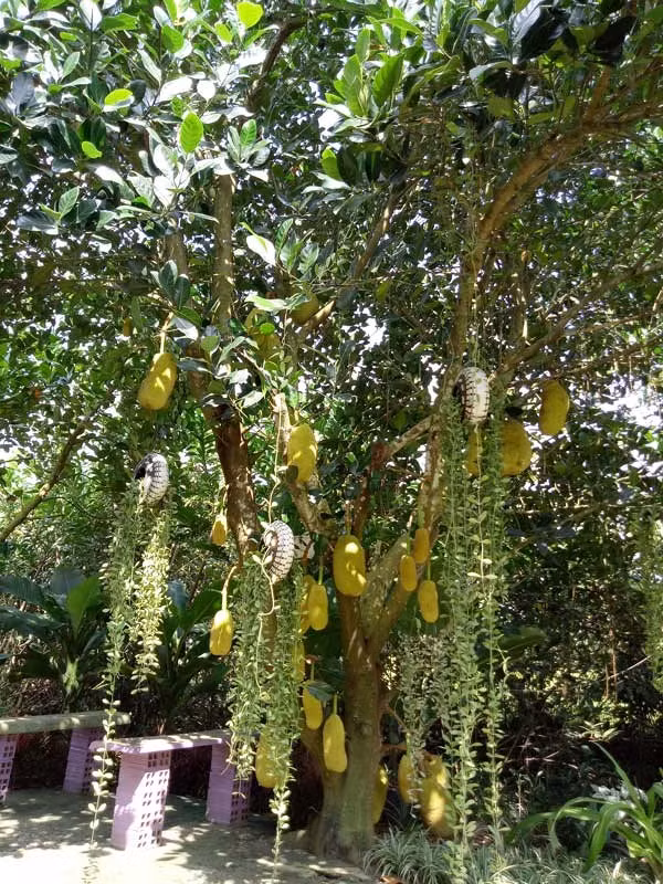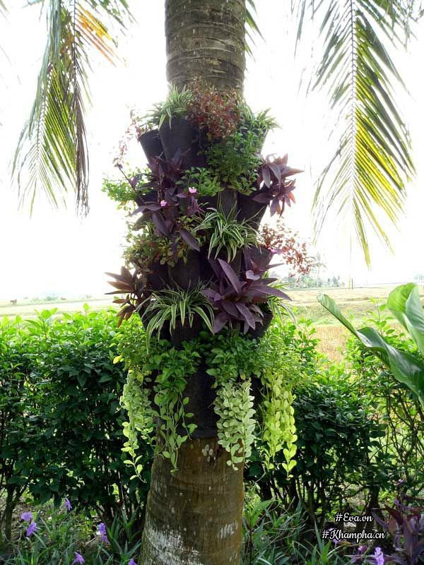 Cường kể, anh đã phải chở 10 xe rùa đất để có thể tạo độ trập trùng cho vườn và tìm hiểu, học cách trang trí ở những khu vườn nổi tiếng trên mạng để áp dụng vào cho khu vườn nhà mình. Anh tận dụng những vật liệu không còn sử dụng trong gia đình nữa như lu chứa nước, bánh xe, chai nhựa, chậu bể, gáo tưới nước để trồng cây, trang trí cho khu vườn.