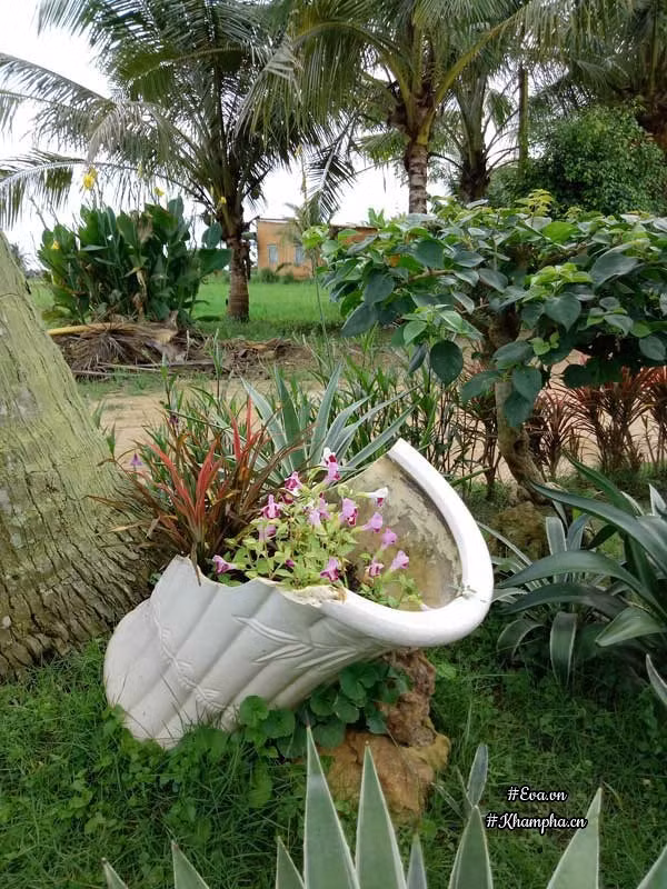 | Cường tận dụng những đồ đã cũ, không dùng đến trong nhà để trang trí cho không gian xanh của mình. |