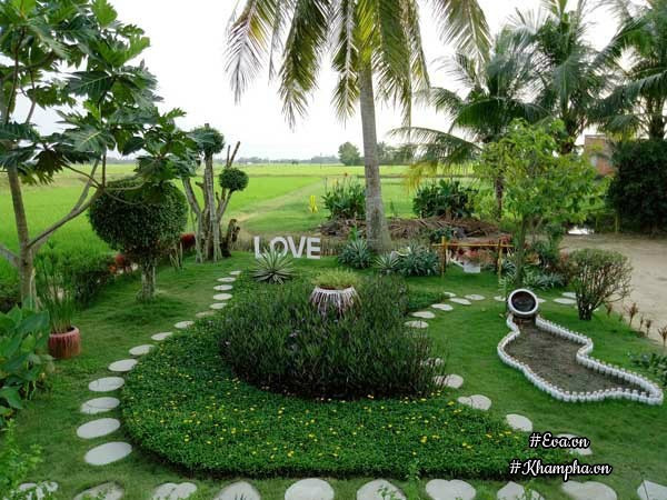 | Khu vườn thơ mộng bên đồng lúa xanh ngát xanh do Cường tự tay thiết kế. |