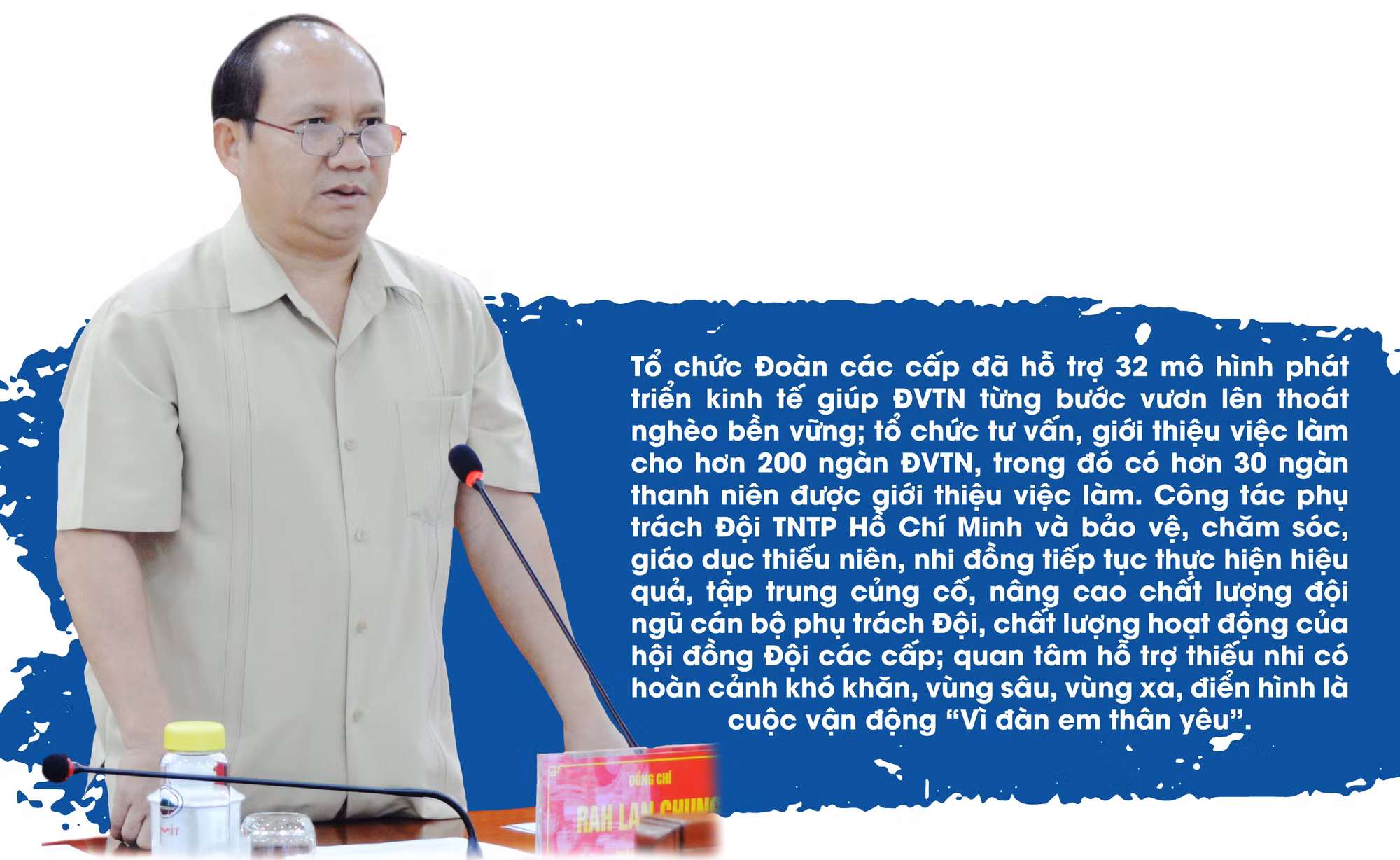 - Đồng chí RAH LAN CHUNG: Bối cảnh hiện nay đặt ra nhiều cơ hội và không ít thách thức cho tổ chức Đoàn và phong trào thanh thiếu nhi. Quá trình hội nhập quốc tế và cuộc cách mạng 4.0 đã tạo cơ hội cho nhiều thanh niên khởi nghiệp, hội nhập; công tác Đoàn cũng có những bước phát triển phù hợp. Tuy nhiên, bên cạnh mặt tích cực và những kết quả đạt được, chúng ta cũng không khỏi trăn trở trước một số vấn đề còn tồn tại, hạn chế và khó khăn, thách thức, đó là: Công tác tuyên truyền giáo dục của Đoàn có mặt chưa thật hiệu quả, thực chất và đi vào chiều sâu. Vẫn còn một bộ phận thanh niên giảm sút niềm tin, phai nhạt lý tưởng cách mạng, sống thực dụng, xa rời truyền thống văn hóa tốt đẹp của dân tộc; tình trạng tội phạm và tệ nạn xã hội trong thanh niên tuy có xu hướng giảm, song vẫn diễn biến phức tạp. Một bộ phận cán bộ Đoàn chưa thực sự nhiệt huyết, hạn chế kỹ năng, nghiệp vụ, chưa thể hiện được vai trò “thủ lĩnh thanh niên”. Một số hoạt động của Đoàn còn mang tính hình thức, dàn trải, thiếu bền vững. Tình hình đó đặt ra cho tổ chức Đoàn không ít thách thức, yêu cầu. Trong đó, cần tập trung vào một số nội dung trọng tâm sau:
