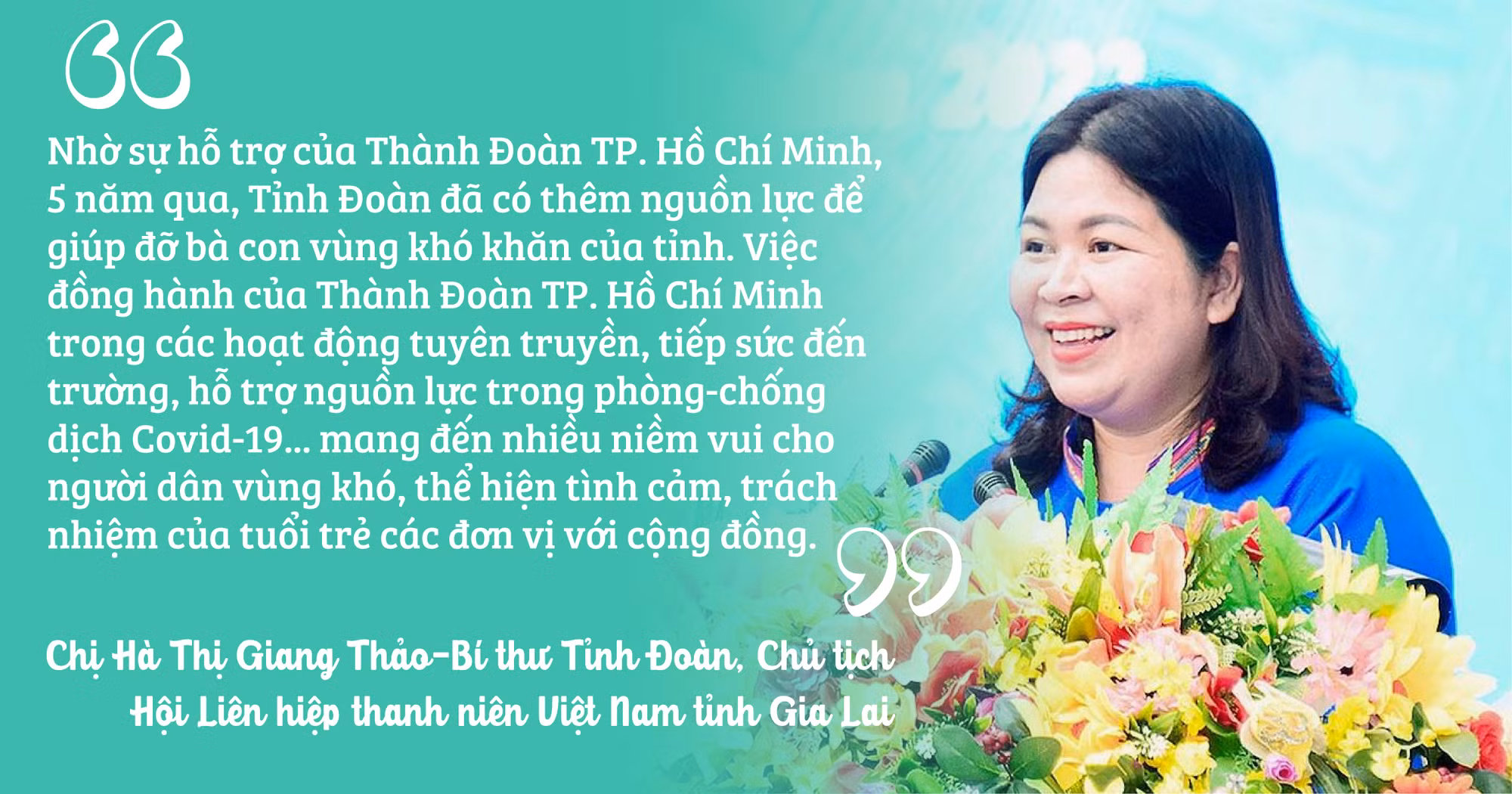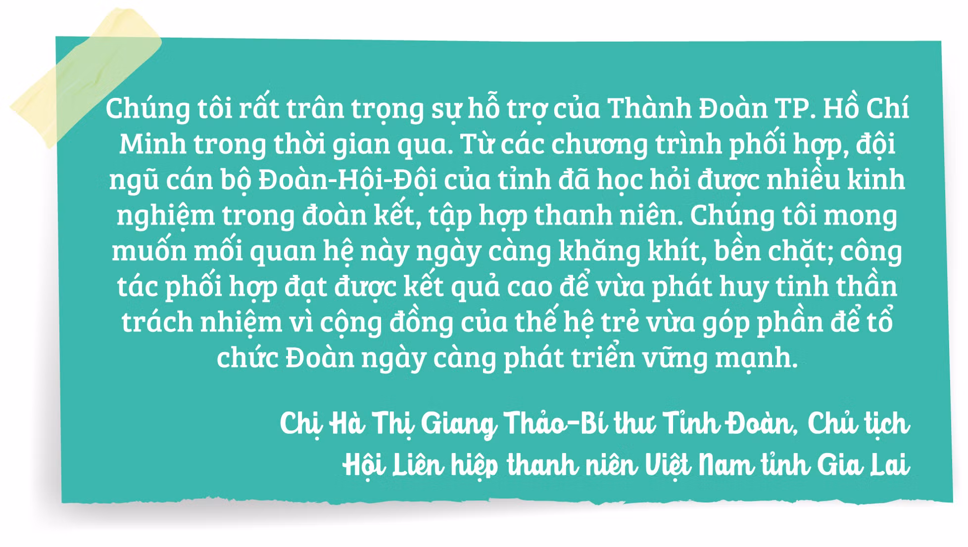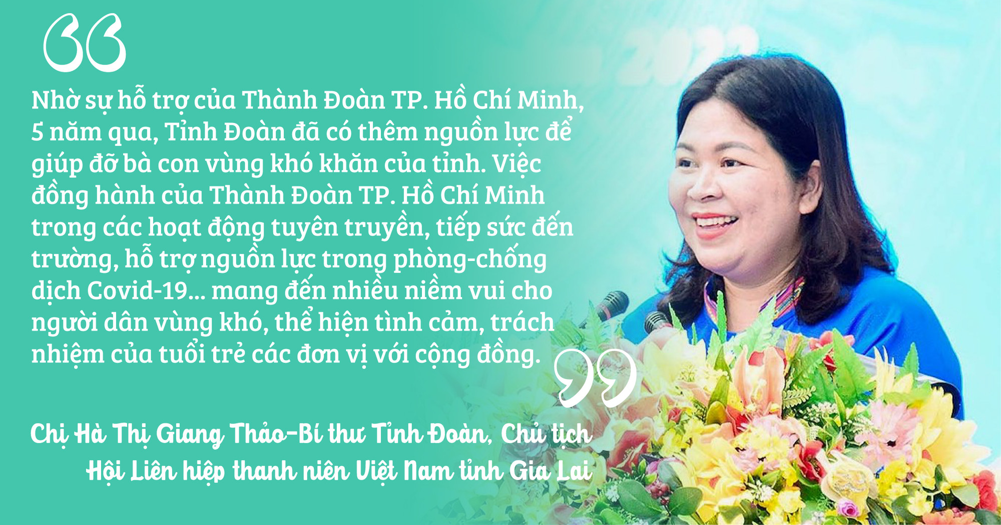 Chị Phan Thị Thanh Phương-Bí thư Thành Đoàn TP. Hồ Chí Minh-chia sẻ: Gia Lai là tỉnh có diện tích rộng, đông đồng bào dân tộc thiểu số. Chính vì thế, Thành Đoàn TP. Hồ Chí Minh có trách nhiệm đồng hành cùng Tỉnh Đoàn Gia Lai trong các hoạt động thiện nguyện, tư vấn-hướng nghiệp… Thông qua chương trình phối hợp, chúng tôi có cơ hội gặp gỡ, học hỏi, đúc rút những kinh nghiệm để cùng nhau thực hiện có hiệu quả công tác Đoàn và phong trào thanh thiếu nhi hàng năm.