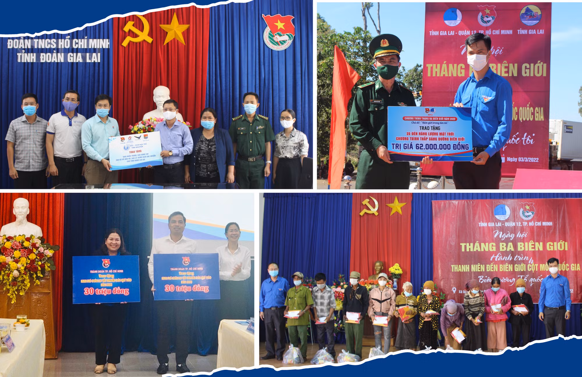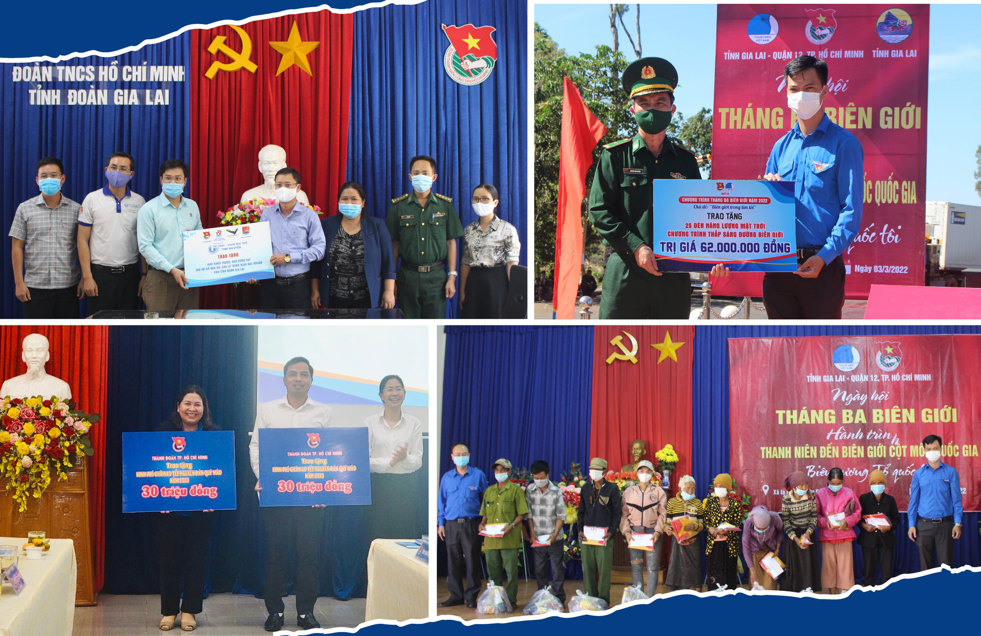 Trao tặng 100 suất quà, 200 lá cờ Tổ quốc, 25 đèn năng lượng mặt trời, 2 máy lọc nước, 10 suất học bổng, 2.000 chiếc khẩu trang, 1.000 quyển vở… với tổng kinh phí hơn 200 triệu đồng cho người dân huyện Đức Cơ và Đồn Biên phòng Cửa khẩu Quốc tế Lệ Thanh là những hoạt động ý nghĩa mà Tỉnh Đoàn và Thành Đoàn TP. Hồ Chí Minh phối hợp thực hiện trong năm 2022. Nguồn kinh phí do Thành Đoàn TP. Hồ Chí Minh huy động nguồn lực xã hội hóa. Ông Siu Man (làng Bi, xã Ia Dom, huyện Đức Cơ) cho biết: “Sự tham gia đông đảo của đoàn viên, thanh niên đã tạo không khí sôi nổi cho chương trình thiện nguyện. Nhờ có sự phối hợp của 2 tổ chức Đoàn, bà con ở vùng biên được nhận nhiều phần quà có giá trị”.