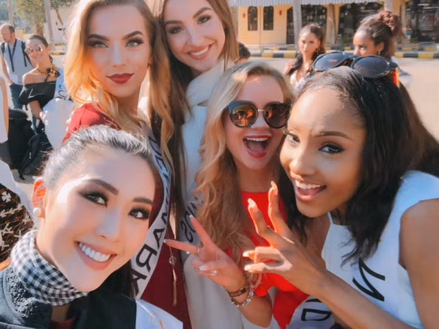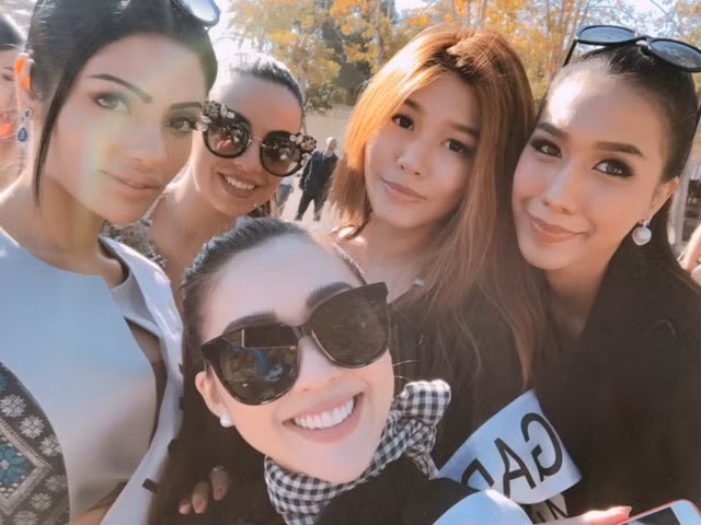 Các người đẹp thích thú với món quà của Tường Linh tại Hoa hậu Liên lục địa.