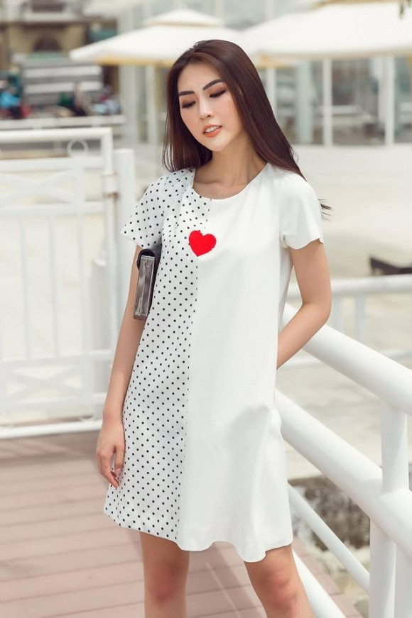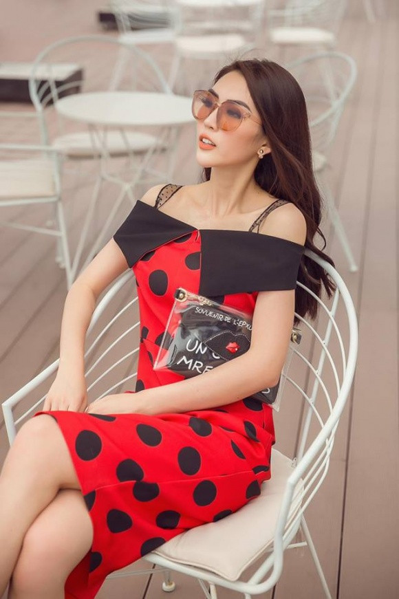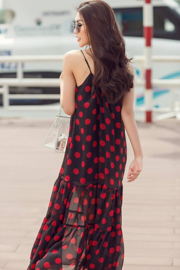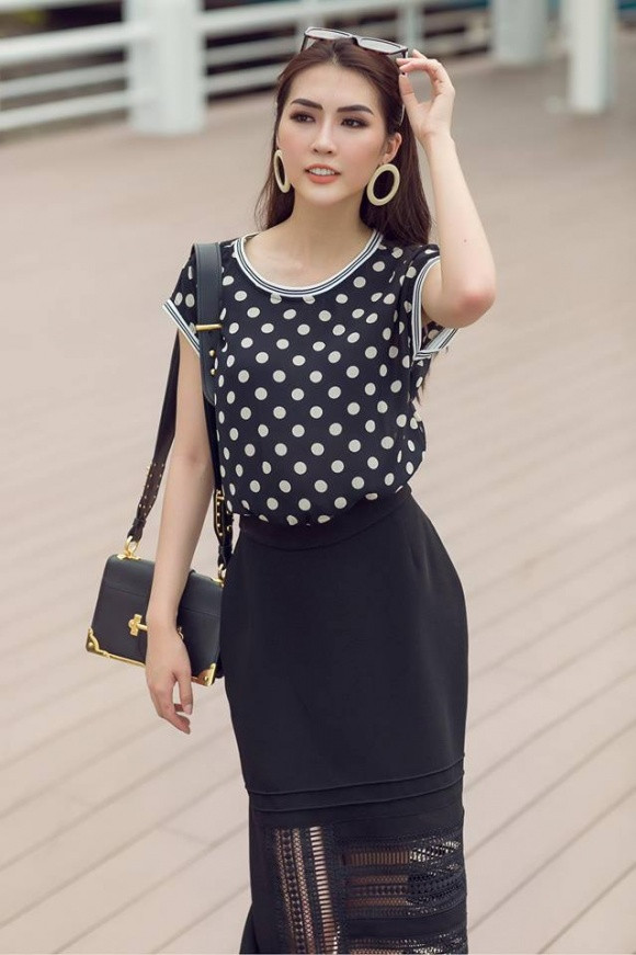 Street style khi xuống phố của Tường Linh vừa nhẹ nhàng lại toát lên sự thanh lịch. Với trang phục họa tiết chấm bi, cô nàng đã khéo léo mix với các phụ kiện đơn giản để tránh rối mắt và tôn lên nét đẹp cho người mặc.