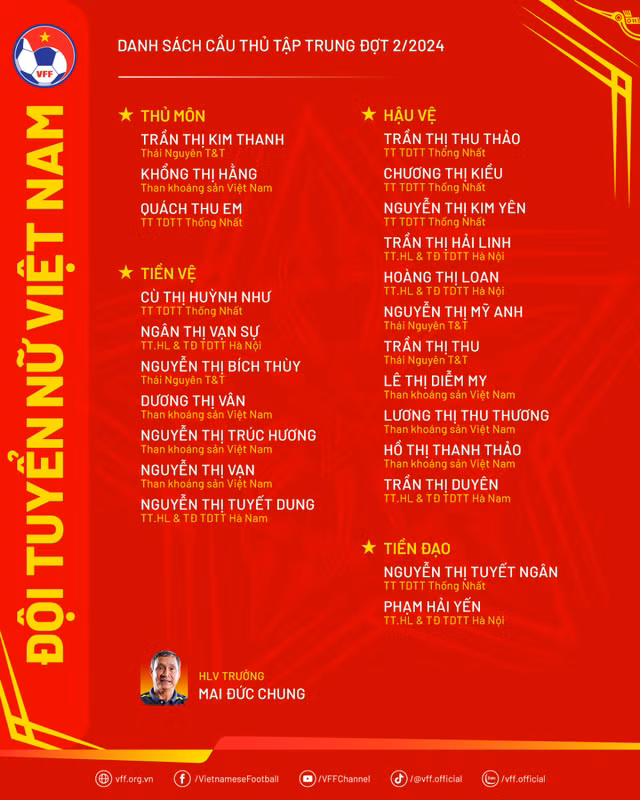 Ở đợt tập trung lần này, chuyên gia thể lực Cedric Roger sẽ trở lại hỗ trợ HLV Mai Đức Chung, cùng với các trợ lý Đoàn Minh Hải, Đoàn Thị Kim Chi, Nguyễn Thị Kim Hồng và Nguyễn Thị Ngọc Anh.