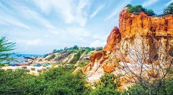Gành Son là khối núi đất sét cứng màu đỏ nhạt sừng sững bên bờ biển.