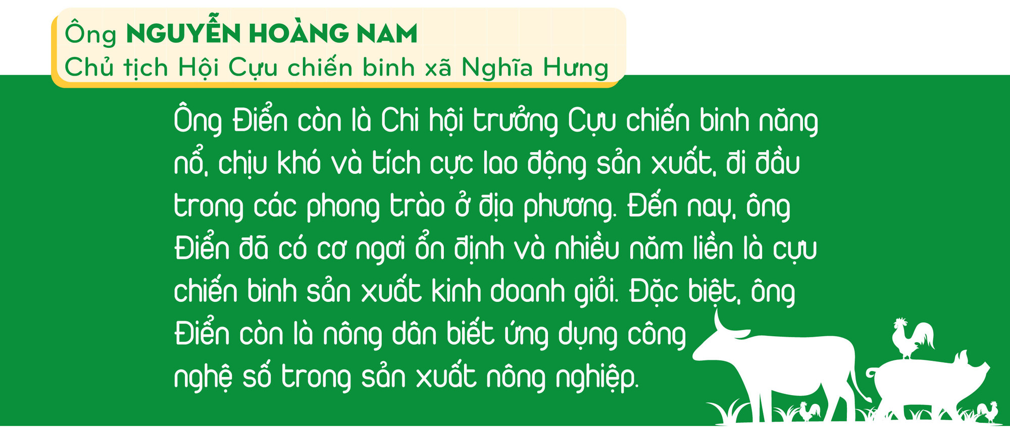 Ông Điển cho rằng: Bản thân mỗi người, dù ở cương vị nào cũng phải cập nhật kiến thức về công nghệ để bắt nhịp với thời đại. Nhằm giảm thiểu thời gian và công sức trong các hoạt động thu mua thức ăn chăn nuôi, phân bón hay xuất bán heo thịt, cà phê… ông Điển đã thông qua các trang mạng xã hội như Facebook, Zalo để thực hiện các đơn hàng. Ngoài ra, ông chọn hình thức thanh toán qua tài khoản ngân hàng. Từ khi áp dụng chuyển đổi số trong sản xuất, công việc nhà nông của gia đình ông Điển trở nên nhanh chóng, kịp thời và tiết kiệm được sức lao động, chi phí.