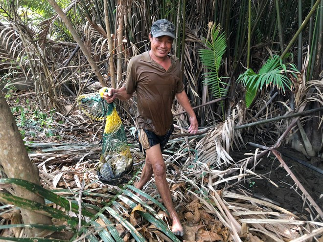 Nói đoạn, ông bước xuống con rạch gần đó và thả lưới. Một lát sau ông trở lên bờ, để nguyên quần áo bết đầy bùn, hạ chiếc nón lưỡi trai cũ mèm xuống đất, tháo bịch ni lông nhỏ buộc quai mũ phía sau lấy ra điếu thuốc lá rồi châm lửa: “Hút hết điếu thuốc này thì xuống thăm cá. Chuẩn bị giỏ đi”. Tàn điếu thuốc, ông lội bùn ra chỗ lưới kéo lên một tay lưới nặng trĩu đủ thứ từ cá phi, cá trê, tôm đất, cua và cả rùa.