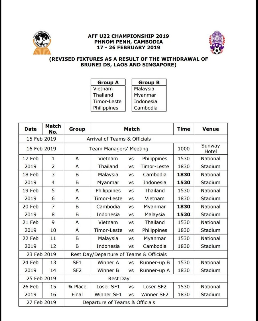 Giải vô địch U22 Đông Nam Á 2019 với sự tham dự của 8 đội tuyển sẽ diễn ra từ 17/2 đến 26/2 tới tại SVĐ Quốc gia Campuchia. Tại bảng A, U22 Việt Nam sẽ tranh tài với các đội tuyển U22: Thái Lan, Timor Leste, Phillippines. Bảng B gồm có các đội U22: Malaysia, Myanmar, Indonesia và chủ nhà Campuchia.