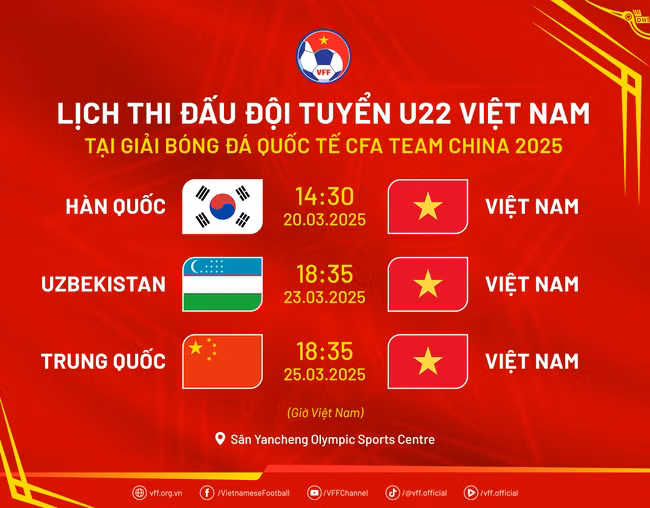Ở đợt hội quân lần này, đội tuyển U22 Việt Nam sẽ tham dự Giải bóng đá quốc tế CFA Team China 2025 do LĐBĐ Trung Quốc tổ chức từ 20 đến 25-3 tại Giang Tô. Thầy trò ông Vinh có dịp so tài với các đội bóng mạnh, giàu chuyên môn như U22 Uzbekistan, U22 Hàn Quốc và chủ nhà U22 Trung Quốc.