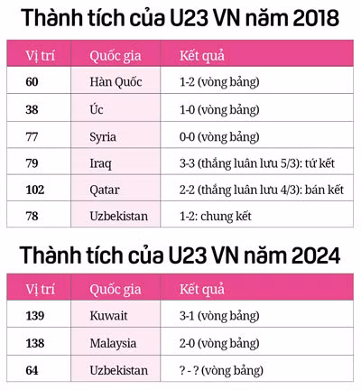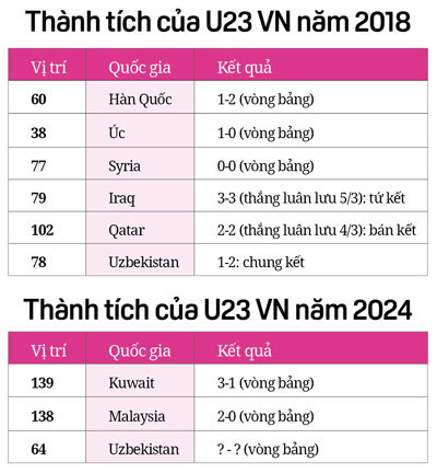 Chúng ta cùng nhìn lại số liệu qua 2 bảng thành tích thi đấu của đội VN tại 2 Cúp U23 châu Á 2018 và 2024 mà khi đó vị trí của bóng đá VN trên bảng xếp hạng của FIFA là 112 và giờ đây là 115. Tuy nhiên năm 2018, đội VN thuộc nhóm hạt giống số 4 khi bốc thăm chia bảng, bất lợi hơn rất nhiều so với đội VN năm 2024 là nhóm hạt giống số 2.