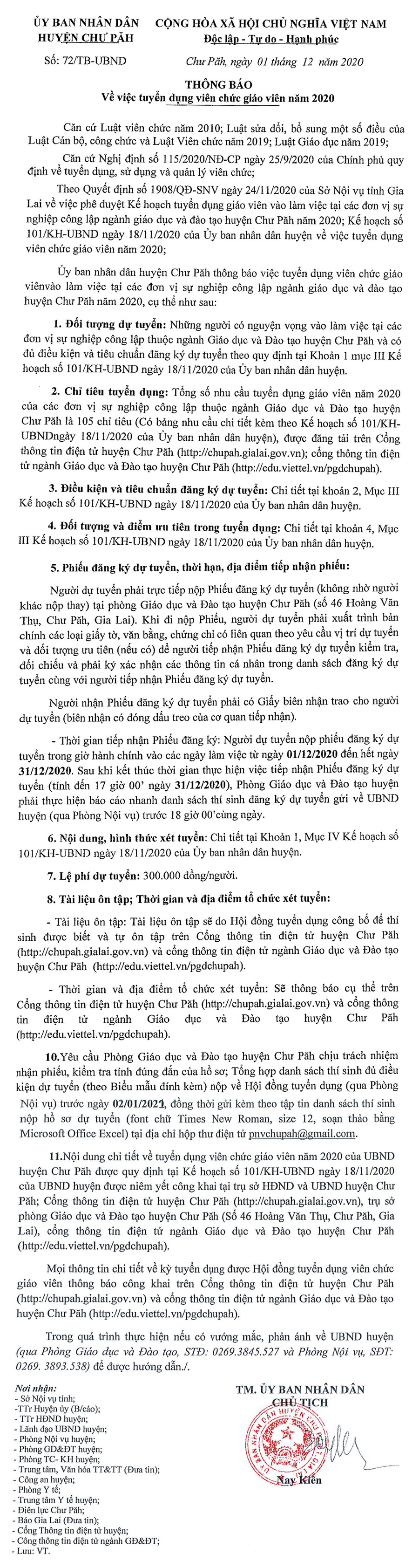 (GLO)- Ngày 1-12, UBND huyện Chư Păh có Thông báo số 72/TB-UBND về việc tuyển dụng viên chức giáo viên năm 2020.