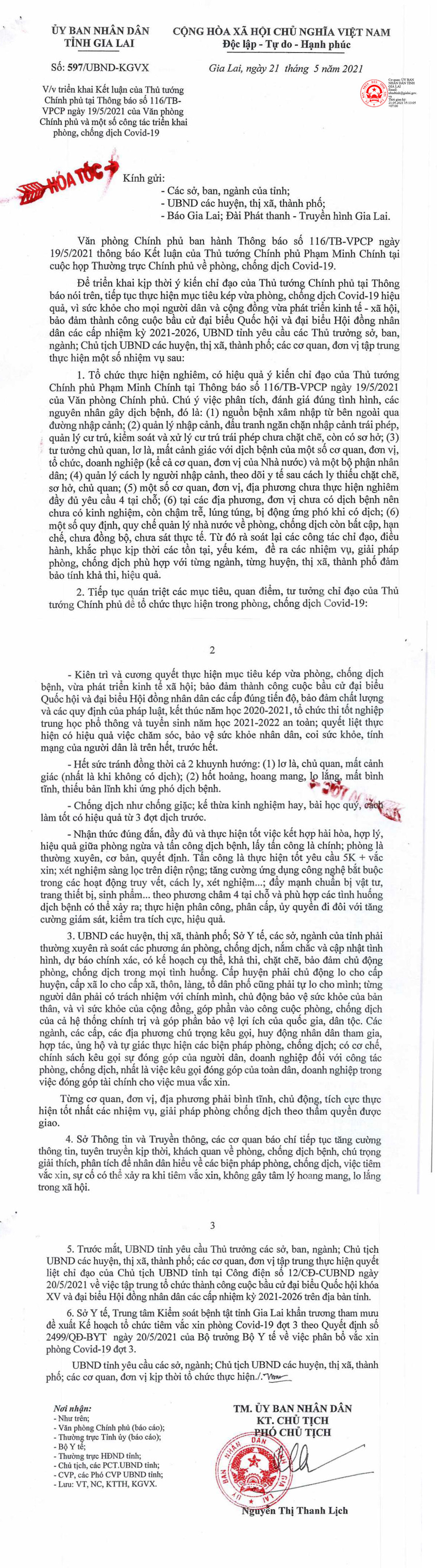 (GLO)- Ngày 21-5, UBND tỉnh Gia Lai có Công văn hỏa tốc số 597/UBND-KGVX về việc triển khai Kết luận của Thủ tướng Chính phủ tại Thông báo số 116/TB-VPCP ngày 19-5-2021 của Văn phòng Chính phủ và một số công tác triển khai phòng-chống dịch Covid-19.
