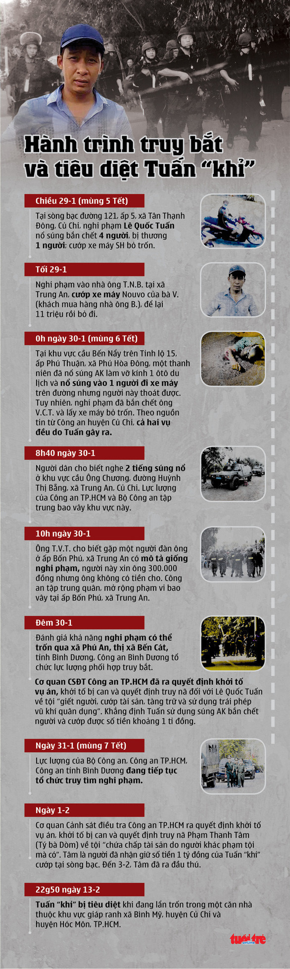 Liên quan vụ Lê Quốc Tuấn (còn gọi là Tuấn "khỉ", 33 tuổi, ngụ xã Tân Thạnh Đông, huyện Củ Chi) xả súng làm 5 người chết ở huyện Củ Chi, ngày 19-2, nguồn tin Tuổi Trẻ Online cho biết Công an huyện Củ Chi đang vận động người dân hỗ trợ tham gia truy tìm vật chứng liên quan đến vụ án.