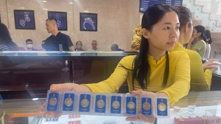 Vào khoảng 9 giờ 15, giá vàng nhẫn 9999 được Công ty SJC niêm yết ở mức 75,2 triệu đồng/lượng mua vào và 76,7 triệu đồng/lượng bán ra, giảm 350.000 đồng chiều mua và 250.000 đồng chiều bán so với hôm qua. Tập đoàn Doji cũng giảm 150.000 đồng cả 2 chiều mua và bán, giao dịch vàng nhẫn 9999 Hưng Thịnh Vượng ở mức 75,6 triệu đồng/lượng mua vào và 76,85 triệu đồng/lượng bán ra. Tiệm vàng Mi Hồng cũng giảm 200.000 đồng cả 2 chiều mua và bán, giao dịch ở mức 75,7 triệu đồng/lượng mua vào và 76,7 triệu đồng/lượng bán ra.