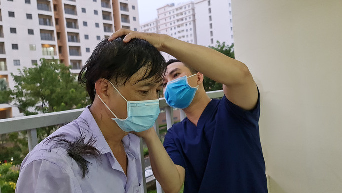 | Bác sĩ Nguyễn Thế Dũng (59 tuổi) nhờ đồng nghiệp hớt tóc tại Bệnh viện Dã chiến thu dung và điều trị Covid-19 số 12 |