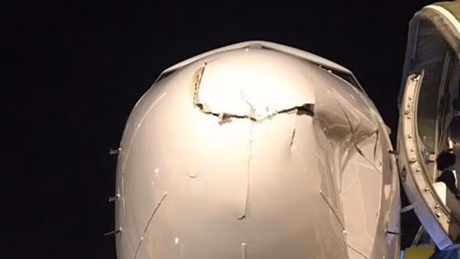 Phần mũi máy bay bị hư hỏng nặng, móp méo sau cú va chạm. Cả 2 vụ việc trên đều được nghi vấn do flycam (thiết bị bay điều khiển từ xa dùng để chụp ảnh và quay phim từ trên không).