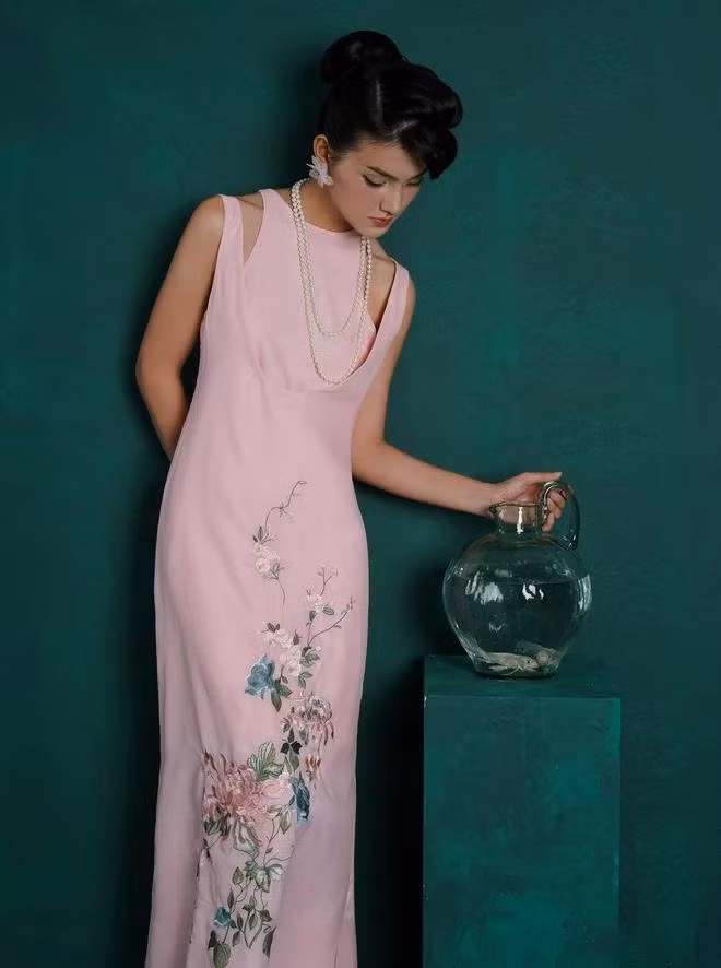 | Những dây hoa leo nở rộ trên nền vải màu pastel nhẹ nhàng, phom dáng suông nhẹ được làm mới bằng cấu trúc hai lớp layer với phần cổ yếm duyên dáng khó rời mắt |