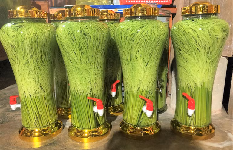 | Rượu đòng đòng có mùi thơm đặc trưng và vị ngọt thanh được bà con người Tày, Nùng ở xã An Nhơn chế biến phục vụ thị trường Tết và có giá bán từ 500 ngàn đồng đến 5 triệu đồng/bình (tùy kích cỡ lớn, nhỏ) |