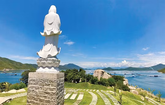 Giữa cung đường mênh mông cát trắng và biển xanh ngăn ngắt đó, chúng tôi còn một phen bất ngờ ồ lên khi nhìn thấy có ngôi chùa to đẹp đang được xây dựng trên một vùng núi đá nhô ra biển, giữa vịnh nước mênh mông.