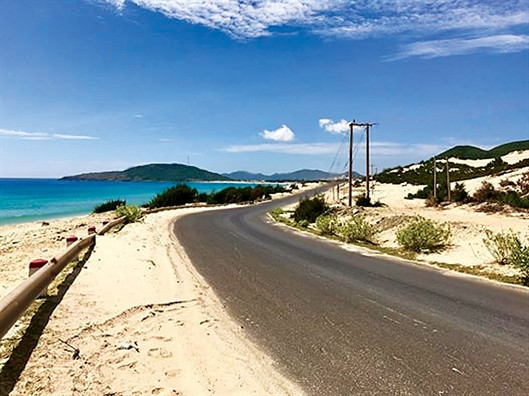 Con đường có đoạn thẳng băng như lao về phía núi xa hút tầm mắt, có đoạn uốn lượn điệu đà, để lộ ra nhưng mảnh biển xanh ngắt giữa những đồi cát chập chùng. Ngắn thôi, chỉ hơn chục cây số nhưng cung đường này kích thích ghê gớm trí tưởng tượng của những người ưa phiêu lưu.
