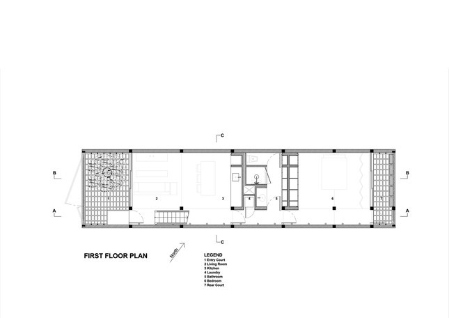 Ngôi nhà tại Đà Nẵng có diện tích 5m x 20m điển hình được thiết kế cho nhu cầu của gia đình thích sự mộc mạc thuần túy bao gồm sân vào, phòng khách, bếp, 2 phòng ngủ, 2 phòng tắm và 1 studio.