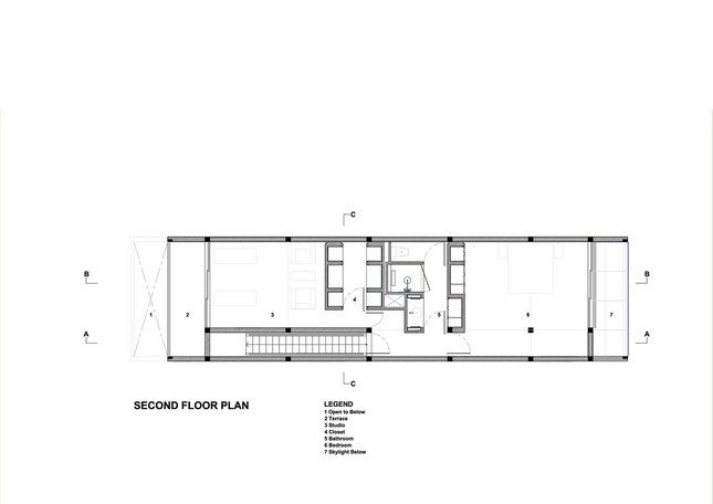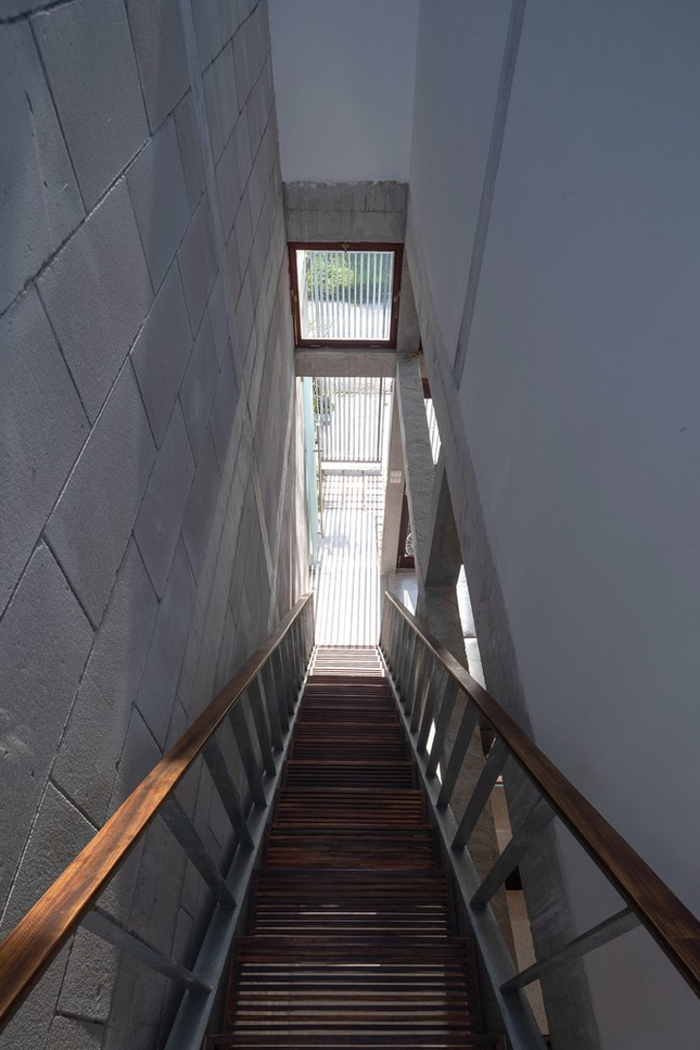 Để giải quyết nhược điểm bí bách, thiếu sáng của nhà ống sâu dài hẹp ngang, giếng trời tại cầu thang được mở, đưa ánh sáng từ trên cao xuống các tầng. Các phương ánh sáng thay đổi theo từng thời điểm nhờ sự chuyển động của mặt trời tạo nên vẻ đẹp mềm mại tự nhiên cho không gian nhà.