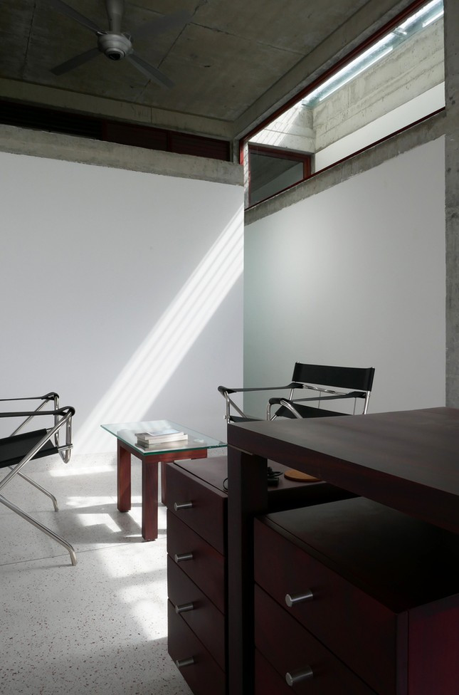 Ngôi nhà có vẻ ngoài giản dị với các khung đỡ và gạch bê tông. Để giảm nóng làm mát cho ngôi nhà trong khu vực khí hậu nắng nóng, nhà thiết kế lựa chọn bê tông được khí chưng áp cách nhiệt giúp giảm thiểu sự truyền nhiệt và ngói đất sét cách nhiệt phủ sơn phản quang cho phần mái.