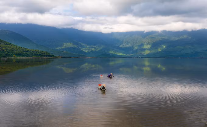 “Không chỉ đẹp khi nắng, vào những lúc trời mây mù, chuyển giông, mưa lớn, dãy núi phía sau đầm như có một bức màn khép lại và biến mất giữa khoảng không rộng lớn. Phóng tầm mắt ra xa, bạn có thể thấy những chòi canh nối tiếp nhau khi mờ khi tỏ tạo nên không gian ấn tượng” - nhiếp ảnh gia Nguyễn Phong (Huế), tác giả bộ ảnh chia sẻ.