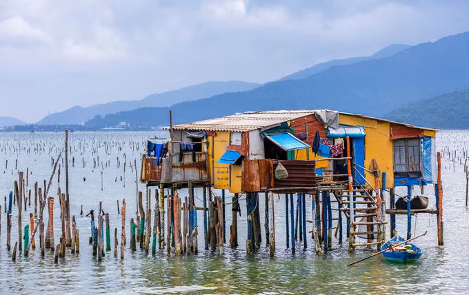 Những chiếc chòi gỗ được người dân tại đầm dựng lên để nuôi và khai thác hàu, một loại đặc sản ở đầm Lập An.