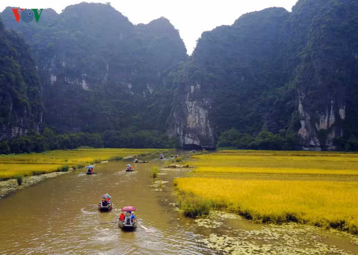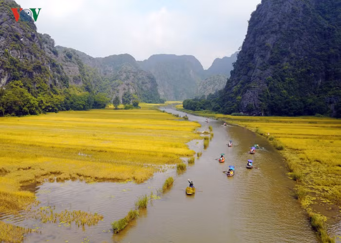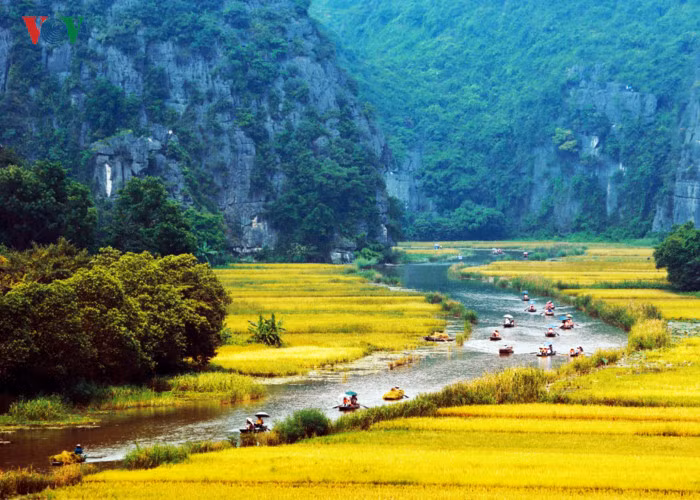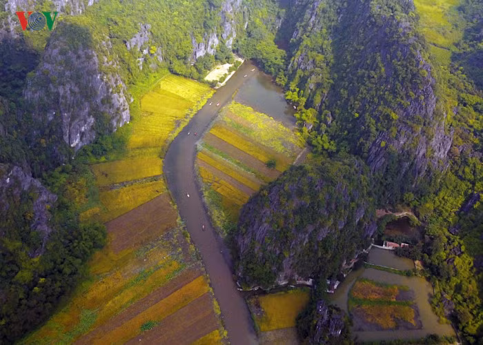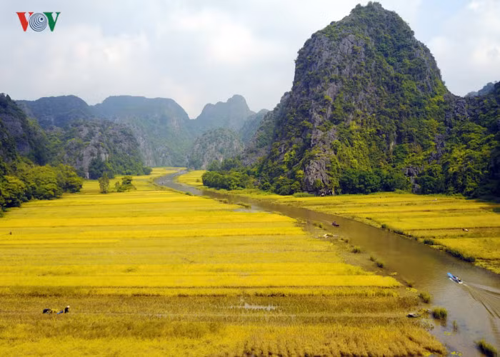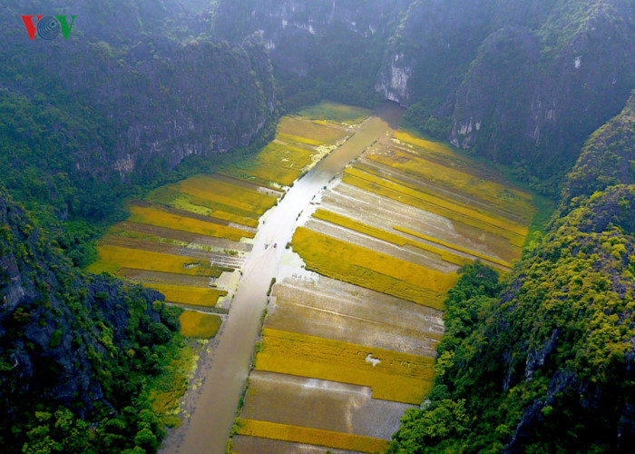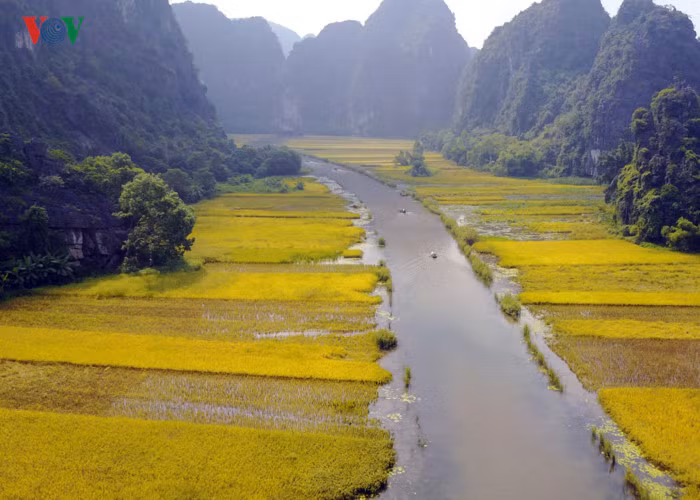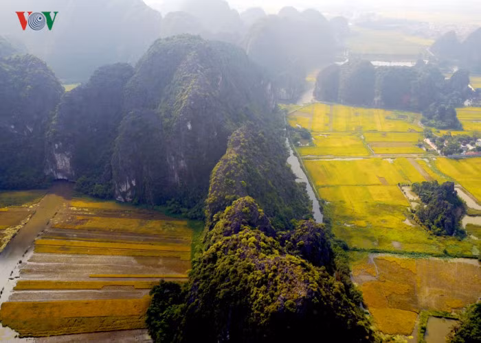 Tháng 5-6, những cánh đồng ở Tam Cốc - Bích Động (Hoa Lư, Ninh Bình) lại khoác lên mình màu vàng rực rỡ của lúa chín, nổi bật bên mảnh xanh tươi giữa núi non trùng điệp, tạo nên bức tranh thiên nhiên tuyệt đẹp.