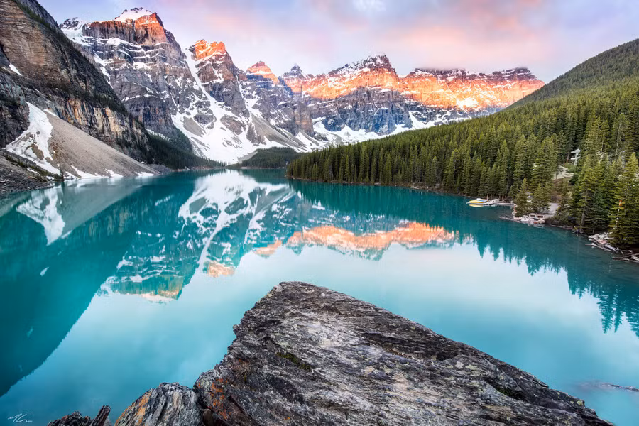 Hồ Moraine, Canada được nhiều người biết đến như một trong những địa danh đẹp nhất thế giới. Sự hòa quyện của đất trời, núi đồi, rừng cây và mặt nước đẹp như gương khiến nơi đây trở thành điểm đến hấp dẫn du khách.