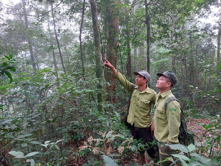 Cán bộ, nhân viên Vườn Quốc gia Vũ Quang làm nhiệm vụ đi tuần tra bảo vệ rừng.