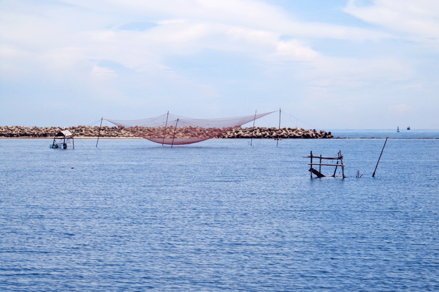Khung cảnh bình yên hoang sơ, vắng lặng của ngôi làng với những hàng rào giăng lưới, những dặng phi lao.