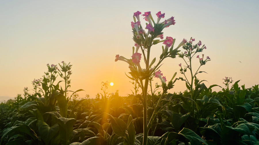 Bình minh tỏa rạng trên cánh đồng thuốc lá xã Phú Cần. Một màu xanh bạt ngàn chạy dài tít tắp tận bờ sông Ba. Bây giờ là mùa xuân, màn sương bảng lảng rải đều trên những tấm thảm xanh mờ ảo. Hoa thuốc lá bừng nở khoe sắc hồng trong ánh ban mai rực rỡ.