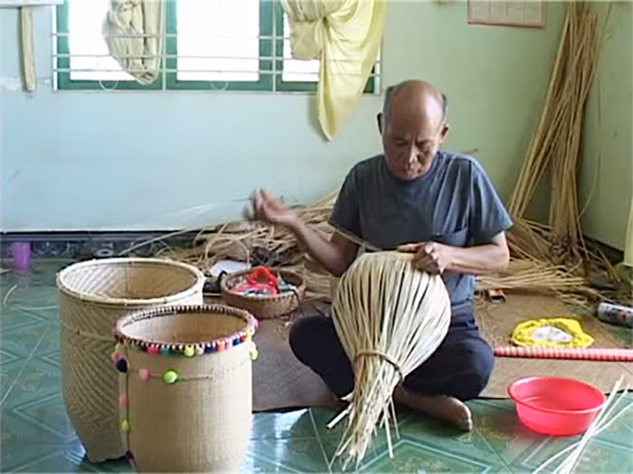 | Già Ya Hiêng mang sứ mệnh lưu giữ và truyền dạy nghề đan gùi cho đồng bào Chu Ru ở bản Pré. |