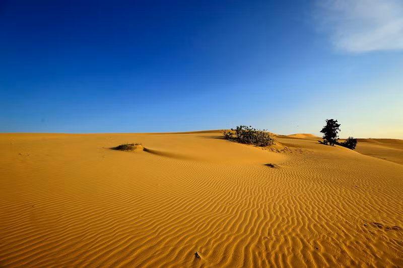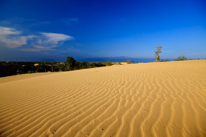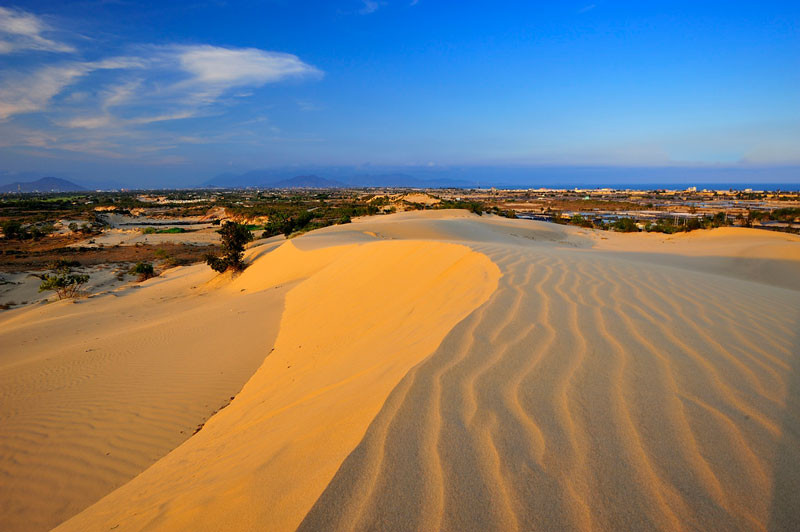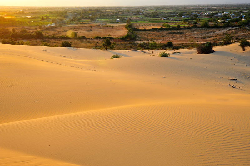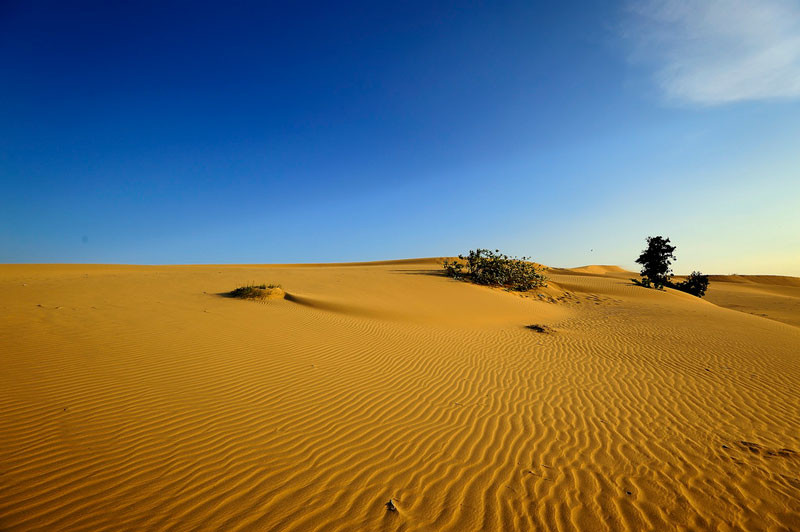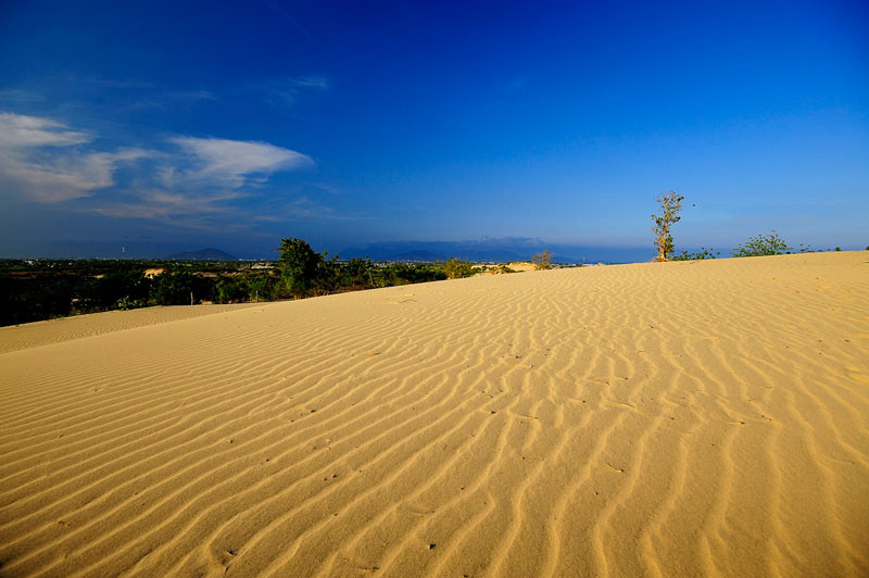 Chỉ cần một đợt gió táp mạnh vào miền cát vàng, thì những đường cong nơi triền cát lại uyển chuyển tạo nên vẻ quyến rũ và lạ lùng khác trước, trông xa như những đợt sóng nhấp nhô.