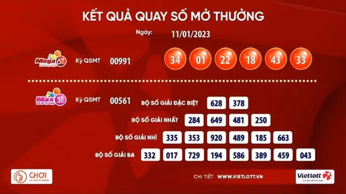Đây là tờ vé số Vietlott đầu tiên của năm 2023 trúng giải Jackpot loại hình vé số Mega 6/45. Vé này có 6 cặp số trúng với kết quả quay số mở thưởng là 34-01-22-18-43-33.