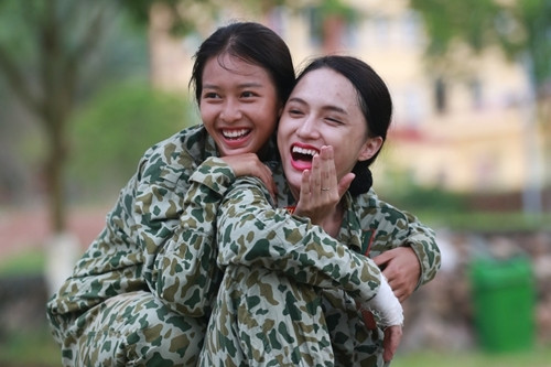 Mặt mộc của Khả Ngân (trái) khi tham gia chương trình "Sao nhập ngũ" (năm 2017).