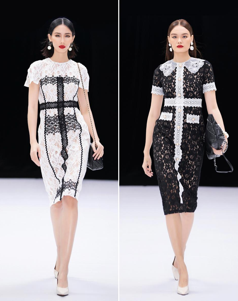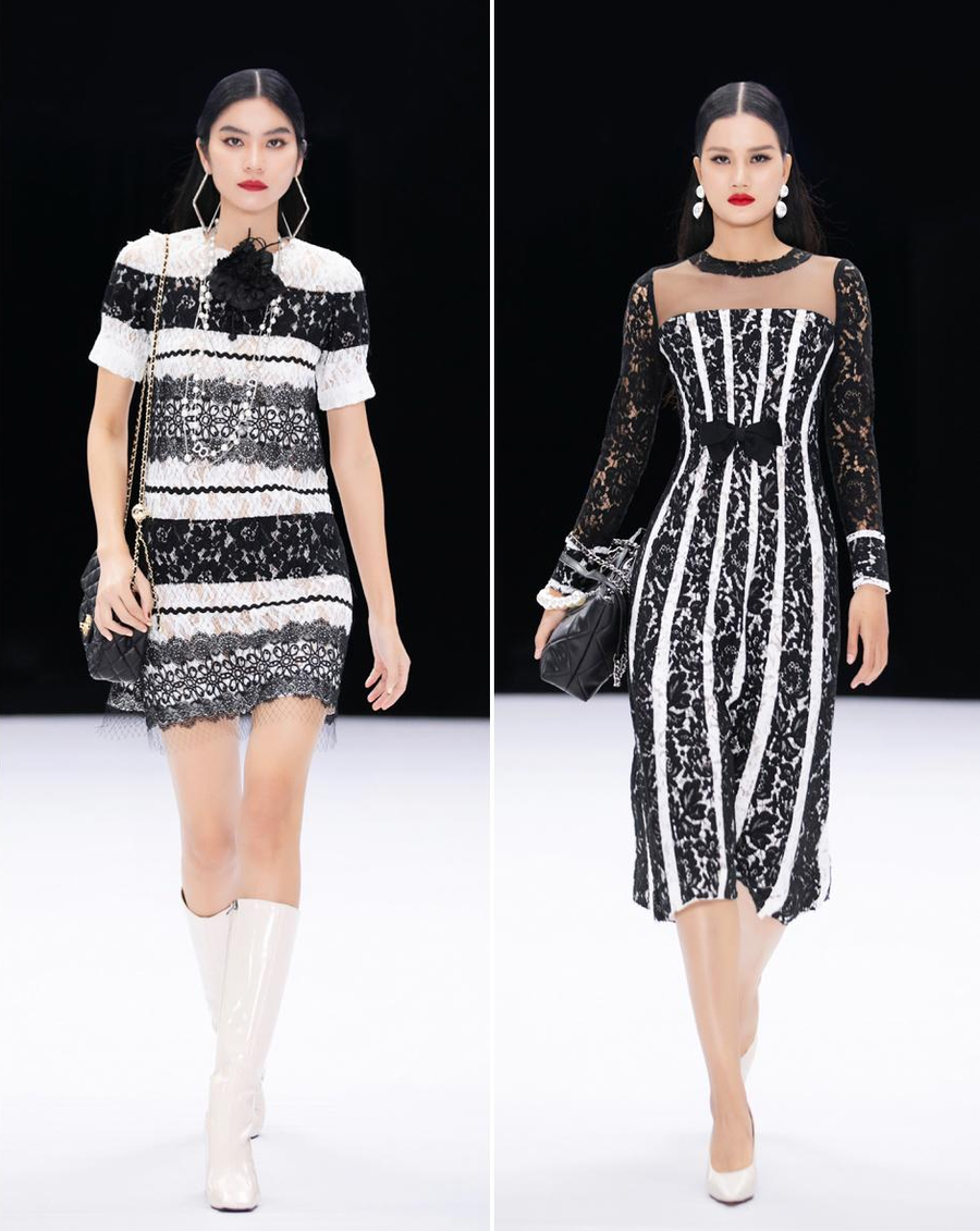 Ngoài vest và trang phục từ vải tweed, không thể không nhắc đến thế mạnh của NTK Đỗ Mạnh Cường ở dòng sản phẩm ren qua sự kết hợp hài hòa giữa hai gam màu đen và trắng.