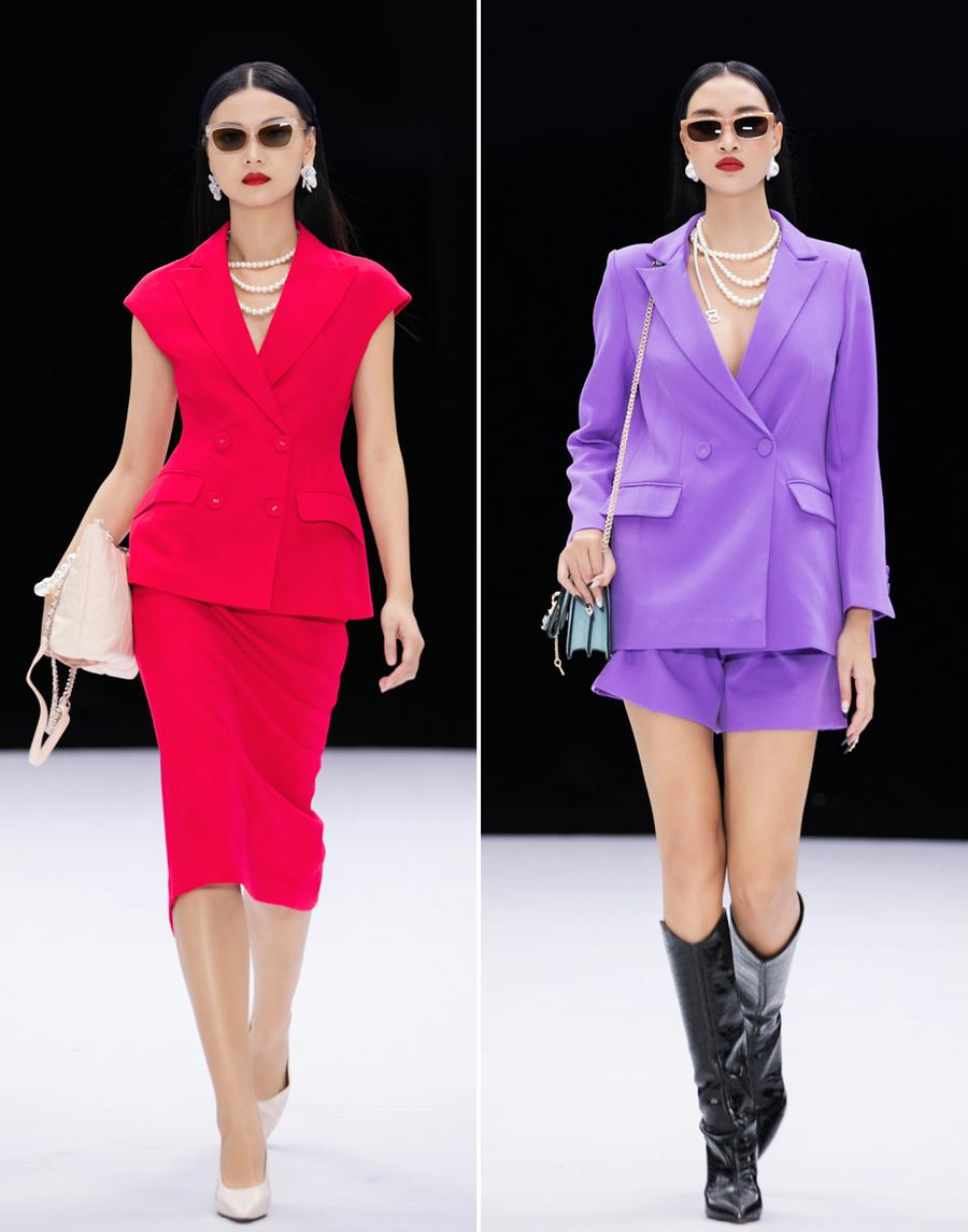 Bên cạnh đó, NTK cũng cho thấy sự đa dạng của vest. Loại trang phục này có thể mặc với quần âu theo phong cách cổ điển, cũng có thể diện cùng chân váy điệu đà hay quần lửng, short trẻ trung, năng động... Một số thiết kế có đường xẻ ngực sâu, trông gợi cảm nhưng vẫn chừng mực giúp dễ dàng kết hợp với phụ kiện đeo cổ to bản nhằm tạo thêm điểm nhấn cho tổng thể.